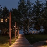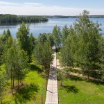 In parallel to the alleyway, a large timber path connects the main terrace of the house to the lake shore, transforming into a pontoon when reaching the lake.