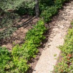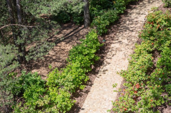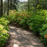 The existing woodland is planted with a collection of rhododendrons, providing bright orange, pink and red colours amongst the pines and birch trees. A meandering path follows the natural topography of the land and allows for a smooth stroll amongst the woodland down to the lake.