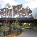 The playful use of material, form and multilayered event programming of the Lodge, Boathouse and Cabana buildings transform the visitor’s expecations and experience of public architecture. Visitors discover amongst a network of paths, playgrounds, skate/bmx spaces and sports courts, open fields and wetlands, a new world where large wooden cranes perch, timber fortresses rise, the walls of buildings bulge and rooftops float, and imaginations can run free.