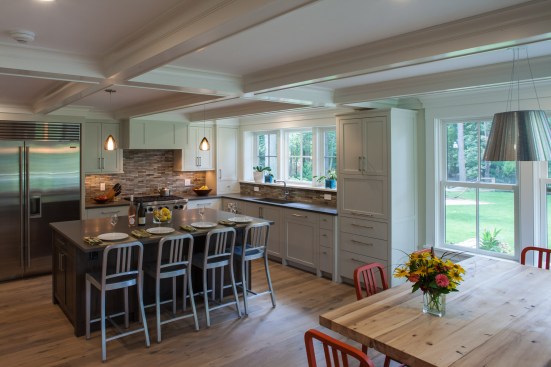 The kitchen became the focal point of the renovation, as it serves as the center of activity in the home. Our goal was to blur the lines between the family room and the kitchen to create a large, open floor plan. The wall of windows along the back complements the generous eating area and takes advantage of the natural light from the beautiful back yard. All new appliances are used in the renovated space, along with new cabinetry that provides exceptional storage space.