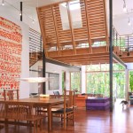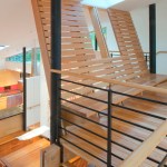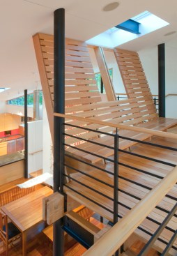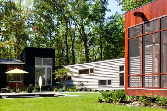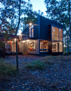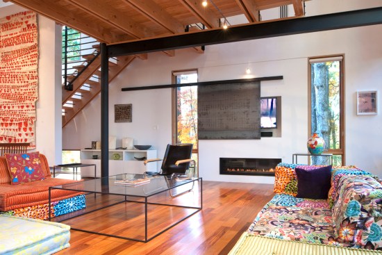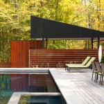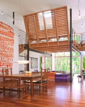 This house is about a courtyard in the woods. It organizes the various pieces of the house and carves out a deer-proof garden, while still connecting both to the rest of the forested site. The owners, a chef and an artist/arts educator, asked for a substantial addition to their small brick house. We proposed leaving the old house largely as bedrooms, and popped up the roof of the original attached garage to create a studio with views of the garden. A new wing contains an open living areas for sitting, dining and, of course, cooking. The old house and new wing form two sides of the courtyard A carport makes the third side, and a rusted steel wall the fourth. Within the courtyard is a pool, a protected garden and a screened porch. Connecting the old house and the new living spaces is a 45-foot-long passage that forms a gallery for some of their lively, and growing, collection of paintings. A basket-like loft floats above the living spaces and provides a retreat with a view of the activity below. Within this simple composition, the house and garden provide a variety of places from, and ways which one can engage the remarkable site.