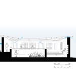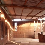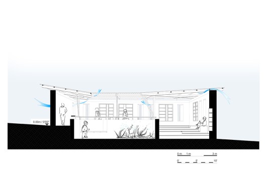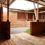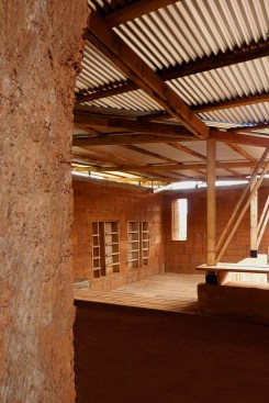 Thick, rammed earth walls pierced with tall, narrow windows insulate the library from the outside without revealing what is hidden inside. As you enter, you discover in a light and cool atmosphere two spaces connected around a landscaped patio, waiting to be used by the school children. The first one, on the same level as the entrance, is ideal for studying and research. The second one, in a hollow space sculpted by terraced steps, invites the visitor to sit for a reading session. The library and its furniture form one whole entity: the wooden bookshelves are directly integrated in the walls, the flared window embrasures can also serve as seating, and a long working table runs along the patio wall. The detached roofing and vertical windows provide ventilation, while the earthen wall structure ensures that coolness circulates through the entire building.