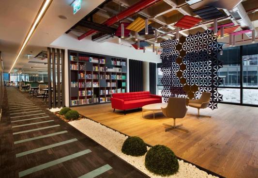 The interiors of the Sisecam Headquarters Building offers an exciting and joyful environment for the employees, which is designed with the purpose of increasing motivation and also generating a luminous and transparent office space by Istanbul-based Bakirkure Architects.