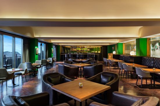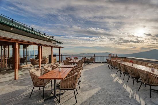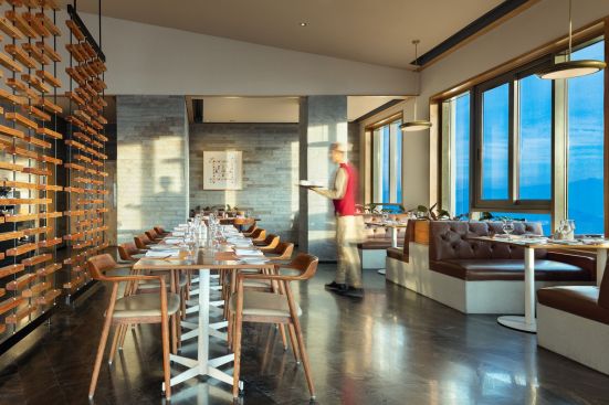 The resort, spread across three levels, comprises zones characterized by specific elements to create a distinct identity. For instance, local slate and Budhpura stone are used within the all-day dining space to create a muted foil for the panoramic views of the Theog valley. In contrast, the wide floor span and low-hung roof of the bar are utilized to create a train carriage-like atmosphere, inspired by colonial-era railway dining cars. For the specialty restaurant, the sculptural expression of the wall cladding draws inspiration from Asian influences as well as the traditions of earthenware in the region.