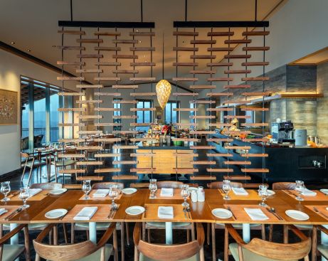 Moreover, the stone-and-timber vocabulary extends into the circulation spaces of the hotel; through the strategic usage of deodar wood as well as hand-carved motifs referencing the art and culture of Himachal Pradesh, the design scheme evokes a sense of continuity as guests move through the spaces.