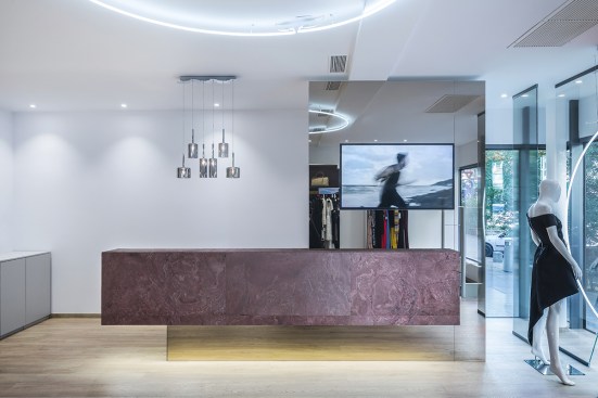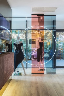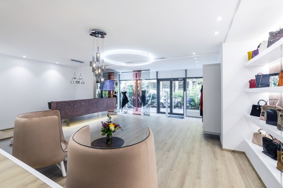 441 Design Studio gave a new luxury store in Bucharest featuring famous brands, a comfortable feel so that customers a very enjoyable shopping experience. For this new luxury concept the designers have naturally turned to the contemporary luxury style. The space has a bright overall look, in harmony with the products sold and in a perfect balanced chromatic manner. The design focused on warm pink shades using flexible stone textures and textile fabrics as differentiators, but also brass that highlights the entire space. The light circles found on both the ceiling and the window are the balance that the store’s founders found between business and the social responsability side. They will have a program through which they will offer to a maternity hospital the newly born baby cart for abandoned children. The glass strips behind the circle reflect the light, and during the night it reflects constrained circles that catch your eye. The clean lines of the design are complemented by both the glamorous finishes and the chosen textures, as well as the subtle elements of the classic style. Everything is designed in oreder to make the shopping experience a very enjoyable one and to help the buyers feel good in a space specially designed for them. The store is located on George Enescu Street nr.2, on the ground floor of the Radisson Blu Hotel in Buharest.