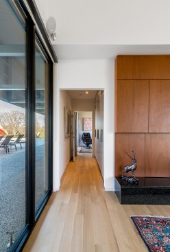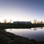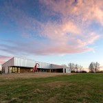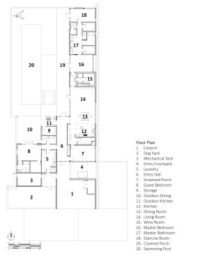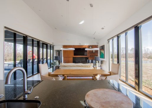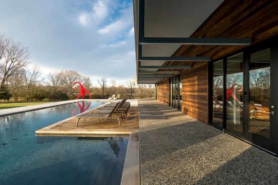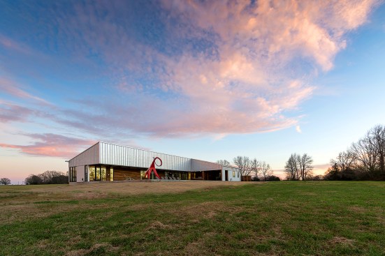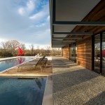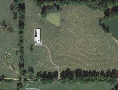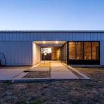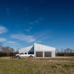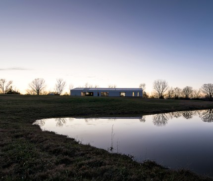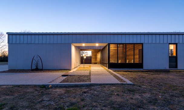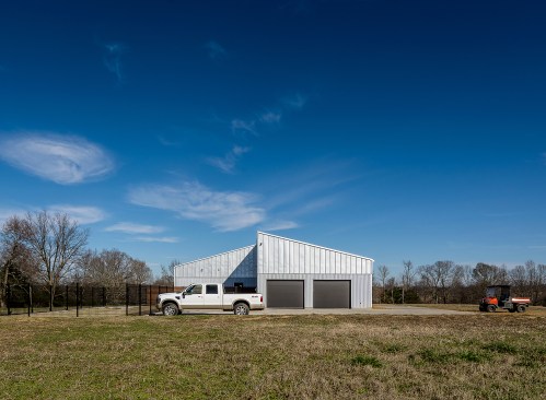 An active couple wanted a simple and clean, yet tough and durable, retirement home. Sited in a cattle pasture in rural Mississippi, this house is a retreat for an active couple to escape busy city life. Appreciating the simple agrarian structures of the region, the clients requested a house that was simple and clean, yet tough and durable. The owners are avid chefs and enjoy outdoor activities like cooking, biking, swimming and dining. A linear bar forms the primary body of the house with its proportions intentionally exaggerated to create a long line when viewed from a distance. The simple form of the shed profile creates a gable when combined with the projection to the rear which frames the pool. The entry sequence begins with a courtyard that punctures the roof and is framed by the screen porch and carport. The screen porch, rear covered porch and the outdoor dining space extend the interior space for outdoor entertaining. Visitors enter into a gallery which continues outdoors under a deep overhang along the edge of the pool. The linear organization of the interior spaces allows the inhabitants to maintain a visual connection to the pastoral landscape from any room in the house. The location of the dog yard and laundry were integral to the design because of the large rescue animals the owners save. A centrally located storm room with concrete walls and ceiling offers a refuge during storms and doubles as a wine cellar. Clad in galvanized metal, the house reflects the changing colors of the sky and landscape and melds into the tall pasture grass much like the old barns of the region.