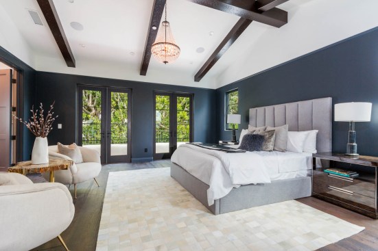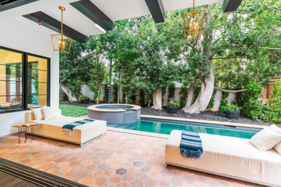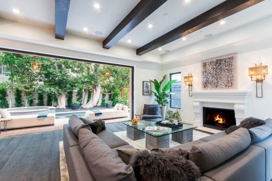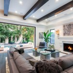 LA Build Corp added a sense of history through design details including built-in bookcases, paneling, and perhaps most notably, exposed beams. “We carried the exposed beams from the front entry of the house to the back outdoor cantilevered patio,” Ami says. “Standing in the backyard looking inside, the length of the beams look incredible and create a long, sleek look for the ceilings. The living room has a Fleetwood slider that opens out to the pool. These enormous doors really enhance a room when they are open as you get the feeling of being in two places at once. You can sit by the fire and still enjoy the view of the backyard.”