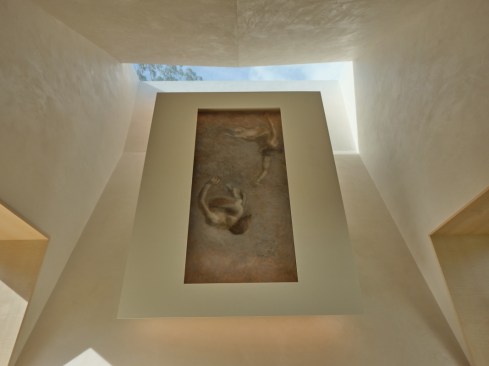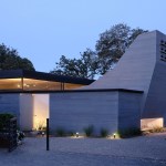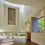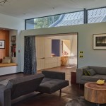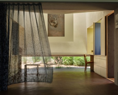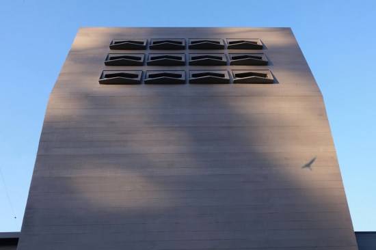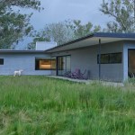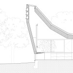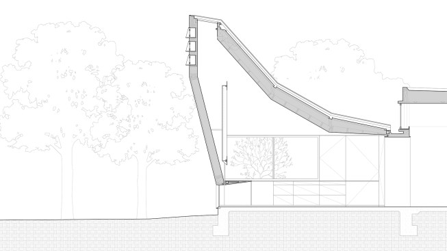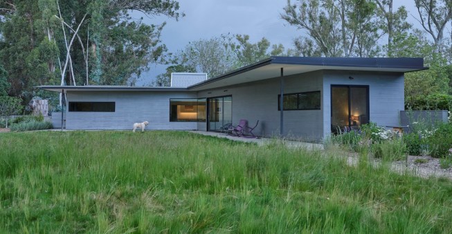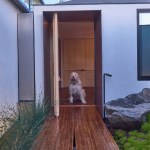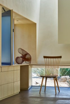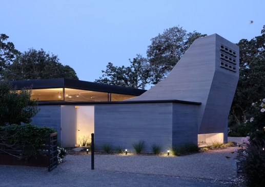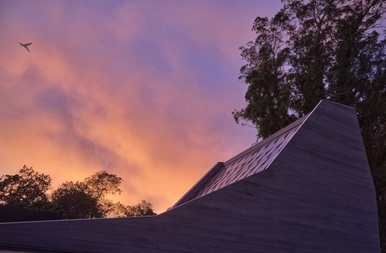 A 390-square-foot studio addition to the owner/architect’s own home in Sonoma, California, this project is just as much an addon for the owner’s Spinone Italiano bird-dogs and the site’s numerous mourning doves. Considering that the native bird species has experienced habitat loss in the region, and the fact that they mate and breed for life, the architect developed a structure that swoops up to form a dovecote—a shelter with nesting holes. Putting a whimsical touch on this feature, the roofing is composed of feather-shaped tiles laser cut from sheet metal. While the 12-hole dovecote is only accessible and viewable outside, a window, spanning the width between the studio’s two built-in desks and from the floor to desk height, treats the dogs to prime views of mourning doves feeding on the ground.