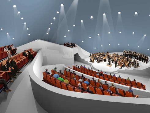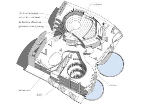 This ideal project is thought to be as a welcoming space, a place where everyone can cultivate their own artistic creativity and enjoy the all entertaining activities. The building consists of four floors all dedicated to Art, Knowledge and Leisure. In this collective place visitors will pursue their passion for Art: creating sculpture and painting works, attending workshops on different topics. In this building there is an auditorium entirely dedicated to the performative arts such as dance and drama. In order to enrich the cultural offer, this building contains a spiral-shaped library as well, where the visitors can enter and read a book.