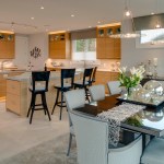 -The kitchen has a nice open connection to the dining area and the river view beyond. A custom buffet cabinet was designed in a contrasting grey wood finish which features a TV lift so the unit is fully concealed when not in use.