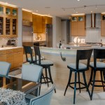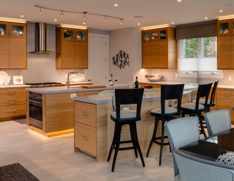 -8 ½’ tall cabinets were used with a row of glass doors along the top which left enough room for a trim board with concealed accent lighting just below the 9’ ceiling. Toe kick lighting around the islands adds to the effect.