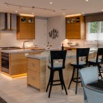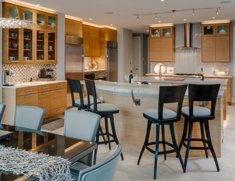 -The second island is across from the beverage center and includes integrated refrigerator drawers, more storage and a floating glass top elevated to accommodate four stools.