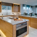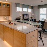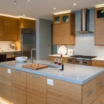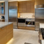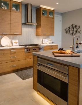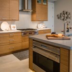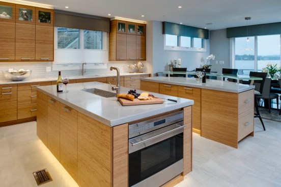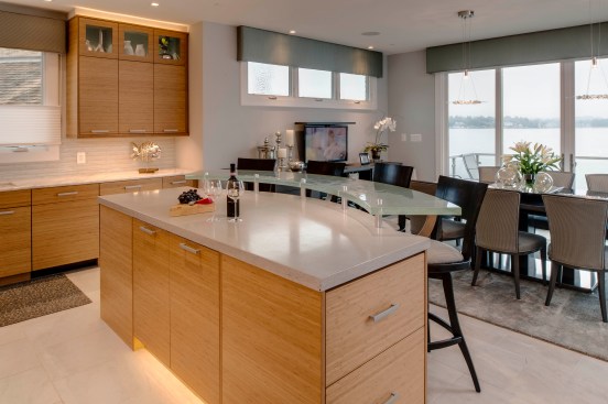-Horizontal grain bamboo cabinets are complimented with light colors on the floor and wall tile. The perimeter countertops are “White Prince” granite with a textured finish and the island tops are light gray concrete. The palette is highlighted with the stainless steel accents of the appliances, fixtures and hardware.