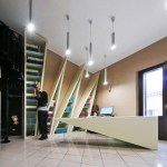 By agreement with the client, who is a great admirer of contemporary art and design, a decision was taken to give the interior a modern, dynamic feel as a specially designed ensemble in which everything is made to measure. The intention of the project was to produce an effect of astonishment on anyone entering the legal office for the first time: the overall effect of the architectural volumes seems to be a precarious balance, and all the items of furniture give the impression of being on the verge of overturning. This gives an impression that the space is in movement.