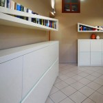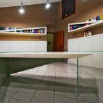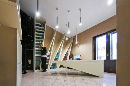 A large bookcase detaches itself from the wall, taking the form of four tall pointed modules that are rotated like a fan and extend all the way to the ceiling. The desk, which is conceived as a futuristic control panel, occupies the central space of the office, imposing itself with a clearly pronounced edge that appears to be suspended in the void: a sharp point that rests on a tempered glass plate which is invisible at first glance. The sense of precariousness and instability is surprising.