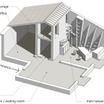 Two tall archive cabinets on opposite walls serve as storage for the client files. Above these archives, two triangular shelves serve as additional modules that enlarge the rich library of this unique law firm.