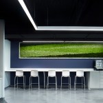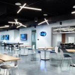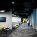 The interior build-out of ABN AMRO Clearing aims to create an environment of improved communication and collaboration for the fast-paced banking and financial trading company. Warm accents among cool hues and graphic details enliven the space. A dark ceiling contrasts the immaculate white walls, capturing a dramatic atmosphere. Wood-wrapped, back-lit elevator surrounds add a bit of elegance into the space at the entrance lobby. These elements of warmth parallel a custom-designed feature wall with wood reveals in the reception area that resonates with the company logo and signage. The character of the company is further highlighted in a custom display case showcasing special awards and trophies. State-of-the-art technology is utilized throughout the office, including in the video conference rooms, to enhance communication and collaboration between employees and clients near and far. Allowing the staff to cyber-connect with sister offices around the globe, the boardroom is equipped with full A/V integration, including microphones, speakers and screens for an expertly digitized workplace. An expansive work café and other out-of-the-box spaces transform an abstract floor plate into a variety of functional spaces. In the café, a array of seating types offer flexibility for large- or small-scale meetings. A long, narrow corridor running along the atrium of the floor was carved into semi-private huddle areas with writing surfaces, mobile seating options, and a graphic feature wall that defines this unique space. Interesting table shapes and arrangements in the conference rooms interplay with the distinct floor layouts of the office. Despite the challenges presented by a unconventional floor plate, extensive site surveys conducted by BOX and the furniture dealer resolved issues early on to deliver a final design that enables efficiency at the individual, team and company-wide levels.