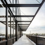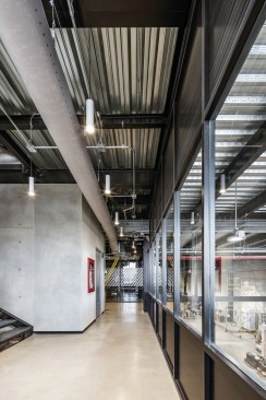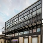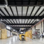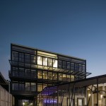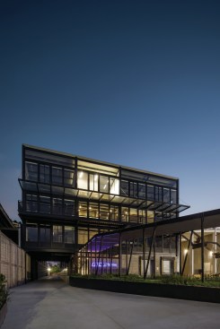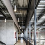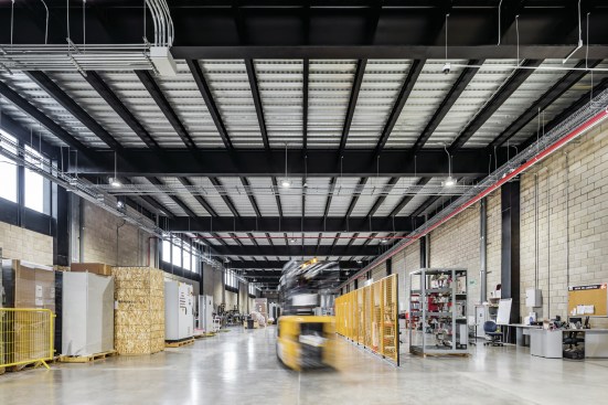 The industrial building has 2,700 square meters of workspace for assembly of electric boards, aside from a four level office building. The building is oriented north-south, opening a series of saw tooth facing south to let in as much natural light as possible into the second level of the industrial plant. The northern façade is covered with crystal windows adapted to the steel structure, and the orientation is ideal to open views to the city and the surrounding parks.