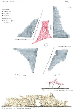 The space where the pavilion is to be located is in between the built masses of D3. The idea was to erect a structure that floats like a cloud in between these volumes and would facilitate the viewing of various products. The structure should convey a sense of hope; hope for a better tomorrow. And how on regular days, everyday materials can be transformed, recycled in a meaningful manner. The bedsprings acts as a coil mesh, distilling the light that passes though it to reveal interesting patterns on the ground. Drawing upon the shapes of a cotton candy, coral cluster in a reef, waves in the ocean and clouds in the sky, the structural system illustrates a series of interconnected posts to support the clouds of mesh. The structure is about going back to the basics, being in touch with the ground, seeing what’s around, experiencing light and interaction.