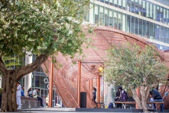 The aim was to create an innovative work of art, predominantly using the recycled materials from Bee’ah. The primary material chosen for the design of the Abwab Pavilion is a collection of meshes in varying sizes. The pavilion is designed to showcase creativity through various domains of art. The structure is designed as a contemporary and inviting space that enables it to be perceived as an artistic expression, while making ample room for exhibits within its core and amalgamating art with architecture. The mesh made out of recycled bedspring coils, envelope the core structure further giving it an organic silhouette. The structure celebrates the shape and character of the material by retaining and representing it in its purest form. Narrow corridors, surrounded by the mesh, create a space filled with filtered light and interspersed by shadows creating a play of patterns. Every stage of the radically minimalistic pavilion enables the viewer to explore the exhibits and the pavilion amidst a creative ambiance.