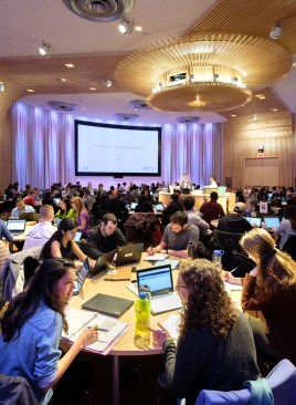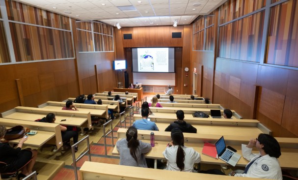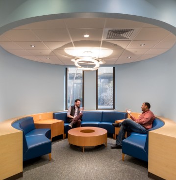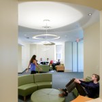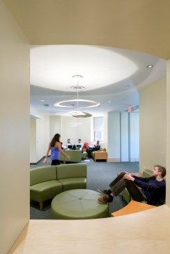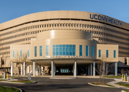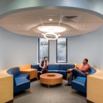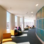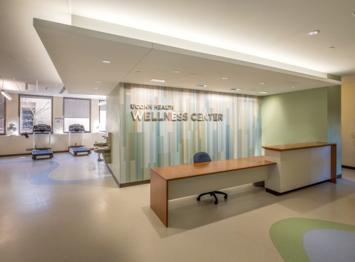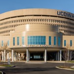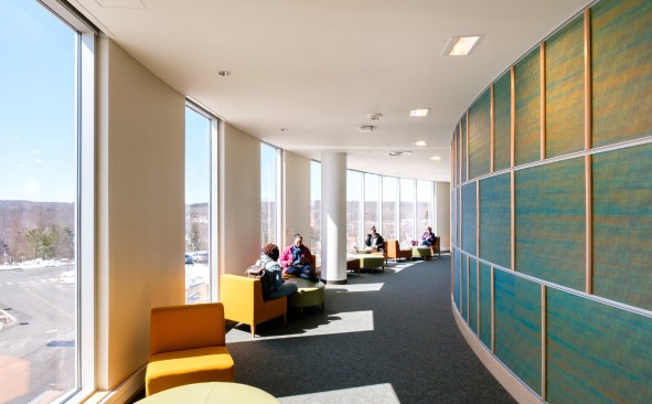 This project included an addition and renovations to the UConn School of Medicine and School of Dental Medicine Building. Along with integrating two academic institutions and providing spaces for progressive new pedagogies, the design also creates a welcoming new identity for the school by means of a dramatic and transparent entrance. The $21 million, 12,800-square-foot addition known as the Academic Building Addition features a large, circular space shaped for small-unit, interactive, team-based learning and is equipped with advanced projection and acoustic technologies to support it. The Academic Rotunda is 3,800 square feet and 75 feet in diameter. The rotunda space is suited for lectures as well as for conferences and catered events for up to 350 people. The space can accommodate 240 students in the team-based learning layout. Smaller group study rooms are arrayed around the central arena space. They can be used either as intimate classrooms or as conference breakout spaces. Certified LEED Gold, the building features circulation areas and balconies surrounding the arena space that are geared for informal study. They provide seating for individuals and for small groups. A broad balcony at the center of the front façade gives students a convenient way to take study breaks and get outdoors for a little fresh air and an unparalleled view of the Connecticut Berkshires. The design Centerbrook developed points to a sea change from traditional, lecture-hall pedagogy toward more modular, self-directed and group-based learning. Advanced technologies for procedure simulations and anatomy visualizations are being explored as well. With incorporation of a Center for Wellness to be used by students and faculty alike, the school will place a special emphasis on wellness – both in practice and in pedagogy. Also included in the project was the renovation of 45,000 square feet of the existing facility. Home to the School of Medicine and School of Dental Medicine, the building was designed by Vincent Kling circa 1970. The Academic Building Addition is one of three recent projects Centerbrook has designed on the UConn Health campus. The UConn Health Outpatient Pavilion opened in 2015 and The Jackson Laboratory for Genomic Medicine was completed in 2014. All are premier projects in the Bioscience Connecticut initiative.