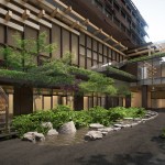 “The thought was to create a hotel that is connected to Kyoto and open to the surrounding area. To begin with, the proposition was to create a dense garden where communities, as well as the past and the present, are connected to this venerable land with its various gardens, which have existed since the Heian period. The existing Kyoto central telephone office building was designed by one of the great Japanese modern architects Tetsuro Yoshida. Through the central courtyard, this red brick building will converse and create a new harmony with a wooden grid system that reminisces traditional Kyoto. The integrity of Aneyakoji road and Higashino-toin road was preserved through the delicate use of fine louvers and meshes. These louvers and meshes also act as environmental devices, which gently filters light and wind. Furthermore, the concrete was mixed with iron oxide to produce a fine warm color, which cannot be fabricated by paint. Every detail and material was thought through to connect the building, land and history together. Ace Hotel is changing the definition of the hotel by connecting the surrounding area with the hotel, and the community with the guests. This is gently changing the air of the world.”—Kengo Kuma.