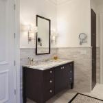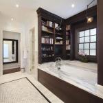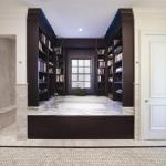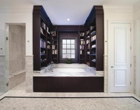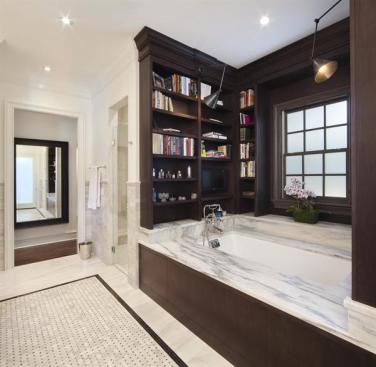 The lady of the house asked for a unique bath retreat that combined her favorite things: Bubble baths, Books, and Music. Builder/architect Phil Kean delivered with what amounts to a master bath library. Its deep soaking tub is set in Marble and ensconced in Mahogany wood bookcases. That same combination of materials carries over to a custom vanity. The traditional look, Kean says, maintains the architectural character of this Georgian-style home.