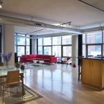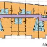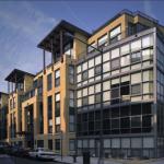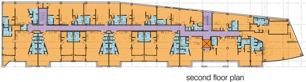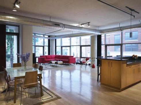 Hickok Cole Architects used a variety of gestures to manipulate the 300-foot-long structure, including interwoven balconies, a façade that steps back and forth, and a glassy four-story volume at the south corner that resembles the prow of a ship. “We held the building three feet off the street because it was so narrow and we asked for additional height to get the density the client wanted,” says project architect Laurence Caudle, RA. Inside, floor-toceiling metal-framed windows, sliding barn-style doors, and transparent room partitions impart the quintessential loft aesthetic that attracts hip urban buyers.