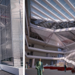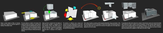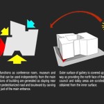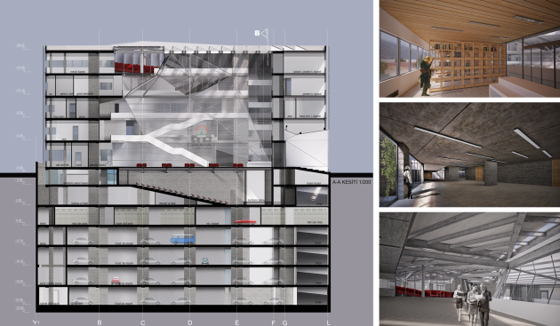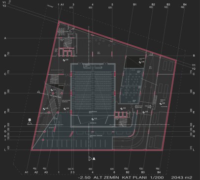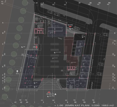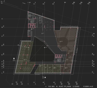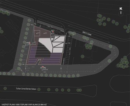 The building, on the land of Turhan Cemal Beriker Boulevard, as being Adana’s outward gate meets at the same time, new comers to the city. As being in discrete and fractured colors and form, it contrasts the city’s warm climate. While looking from outside its shady atmosphere is perceived from fractured notches of main entrances. As entering inside, photovoltaic translucent high and light panels complete the transparent closed courtyard. In a contradiction with outside of the building, the covering mixture of metal moveable net panel and glass combination of council lounge at the top floor begins at the courtyard and hides chairmanship and council of management units in a semipermeable way.Because of the light level the guests that use chairmanship entrance can perceive easily the big gallery but guests that uses mid lobby can perceive hardly the back of net part.