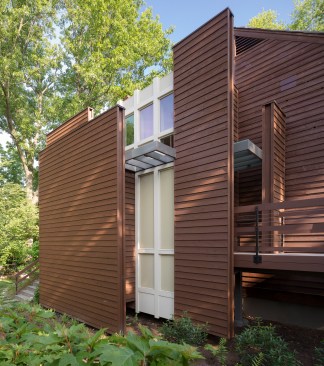A small addition using a palette of existing materials is constructed that implies shifted walls. The design is composed as if the walls have been shifted; exposing glass, color, and letting in light and invitation. The observer can also imagines the addition as a monolithic mass with walls un-shifted so that no glass or color is exposed. The implied un-shifted monolithic form remains sympathetic to the original home’s architectural style: a camp of architecture that investigated a windowless, monolithic aesthetic, prominent in the 1970’s.