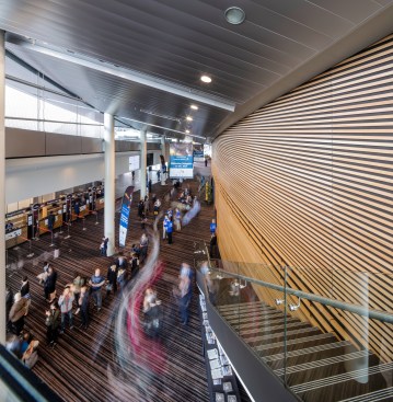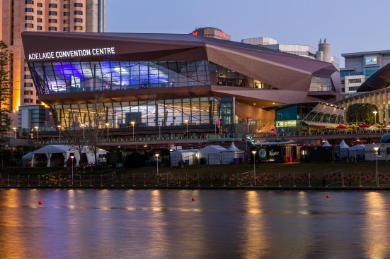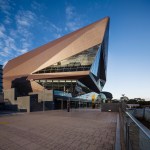 Delivered in two stages, the Adelaide Convention Centre redevelopment includes the addition of a new West Building and East Building on either side of the venue’s existing Central Building, all designed by Woods Bagot. Each building can operate as a standalone facility with its own dedicated entrance and they can also be combined to function as one dynamic venue. Built over active rail lines, Adelaide Convention Centre East is a new multi-purpose venue that includes a highly adaptable plenary, exhibition space and meeting facilities. The new plenary hall replaces Australia’s first convention centre with a modern facility that responds to the physical constraints of its inner-city location by incorporating dynamic components that alter the internal spaces. The East Building utilizes innovative moving parts to maximise the flexibility of the facility and provide many different configurations and sizes of event space. Innovative hinged seating sections can be raised to transform the raked theatre to a dramatic flat floor exhibition space that accommodates 2,500 people. Within minutes the facility can be converted from plenary presentations into smaller lecture theatres. This was achieved by dividing the multi-purpose hall with twin 15-metre-high operable walls, deploying six bays of canted seats and operating two motorised, rotating auditoria – all within a single contiguous volume. Designed, engineered and built in Australia, the Centre’s rotating seating drums are a first of their kind in the region. The shape of the building was inspired by a weathering process that reflects one of the region’s distinctive tourist attractions – a series of eroded granite boulders perched on a rock shelf that fronts the ocean to the south. More than 10,000 individually hand-formed zinc tiles cover the building’s exterior, their soft red pigments referencing the rocky outcrops of the regional landscape. The building form has been fractured to take advantage of prominent views, which were then weathered into softer corners and voids that comprise the windows and doors of the facility. The interior was formed into a faceted, jewel-like space, reminiscent of the indigenous crystals and opals of the outback. With a concept derived from the cross-section of a South Australian rock that opens to reveal its inner beauty and character, the tactile interior form is in contrast to the smooth, weathered exterior.