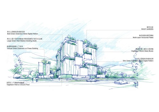 The vertical ecological greening is created to form a three-dimensional landscape system, integrating the architecture and nature. The jagged façade becomes a green wall with creeping plants growing in between the grooves, providing a seasonal and natural wall painting to vitalize the area. In addition, green public spaces are placed on rooftops to create a sustainable working environment.