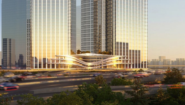 The outline of the towers mimics the shape of a guqin, façade covered with dynamic string-like lines. The nuanced lines combined with different curtain walls evoke simplicity in the office area while the bay windows in the hotel area help maximise landscape view. The overall varied, irregular architectural form compounded with the rounded corners diminish horizontal wind load, achieving perfect unity of function and form.