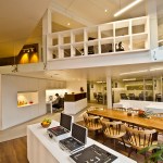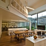 To maximize the area whilst creating a focal design element, a mezzanine has been strategically planned in the space by manoeuvring the beams. The mezzanine functions as a vertical zoning element, dividing the areas on either sides in terms of both functionality and privacy. With the informal work spaces and inclusive spaces below, workspaces that demand exclusivity are placed above, on the mezzanine. The access to the mezzanine itself transforms as a utility, serving as an informal stepped gallery for the users. The inclusion of the mezzanine not only tremendously increases the functionality of the office but also elevates the aesthetics and design sense through visual indulgence.