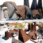 Cool air from the courtyard's shaded concrete walls is drawn up through the shaggy chimneys using the stack effect, and an evaporative mist sprayed from the exterior thatched surface further cools the space. It is a perpetual breeze-making machine, cooling down the visitors. A complex structural arch system defining hyperbolic surfaces is juxtaposed with a rough thatched roof reminiscent of Bernard Rudofsky’s Architecture without Architects. This juxtaposition is part of a search for new promiscuities, new methods of design, after a party of high-formalism that dominated academic discourse at the time. Afterparty looks toward more primitive states of architecture.