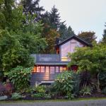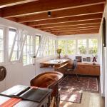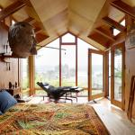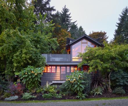 Even though the house needed a large amount of work, for Maskin it was a dream project. He removed the low ceiling in the living room and turned the former attic space into a cathedral ceiling 17 feet tall at the gable. New foundations were added where none existed previously, and seismic upgrades were made. Maskin essentially added a second story to the house – a new stairway with orange plexiglass risers leads to a large bedroom. Here, floor-to-ceiling glass windows give expansive views of the water and Agate Pass. A small second floor terrace was added atop the original screened-in porch, which Maskin converted to a dining room and office. These rooms have views of two gardens that Maskin designed, including one with hardy plants inspired by visits to tropical areas.