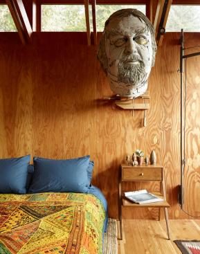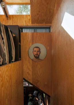 Maskin also designed most of the built-in furniture and cabinets. There are several custom-designed pieces, all made of glulam plywood as the main material, including a daybed in the living room, an armoire, and a bed with built-in storage underneath.