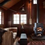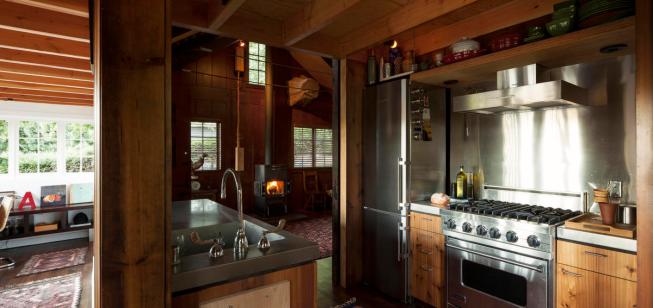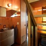Originally, the one-story cabin had low ceiling heights and an attic. The interior walls and ceilings were clad with wide planks of Douglas fir, which would have been plentiful in the area 100 years ago. For Maskin, this was one of the best qualities of the original house – throughout construction, he had a “what comes down must go up” policy for the original wood panels. Each panel taken down for an alteration was repurposed in the new additions, becoming cabinets, new ceilings and storage areas. Throughout the design, Maskin worked to make the different construction periods legible. Modern additions are demarcated with different wood types from the original planks, making it clear to see what was “then” and what is “now.”