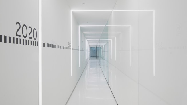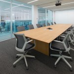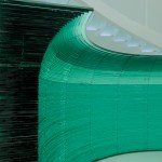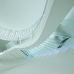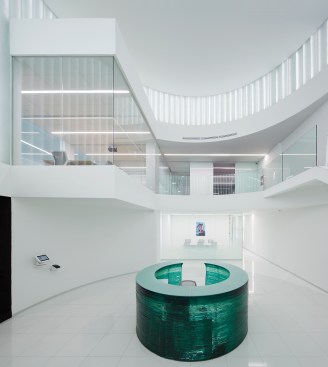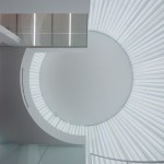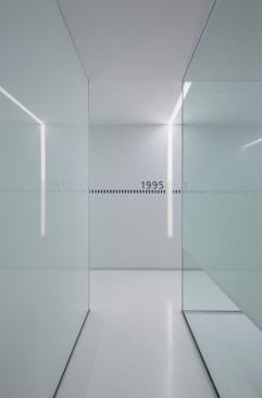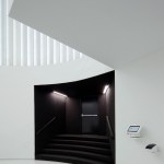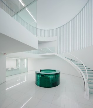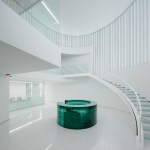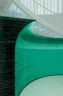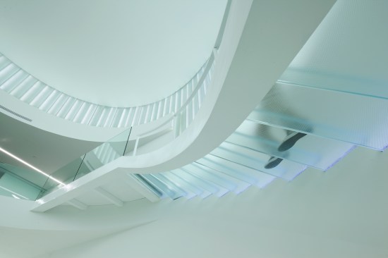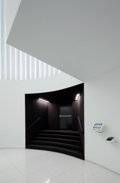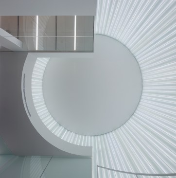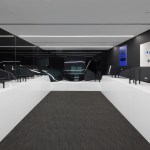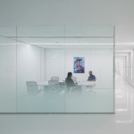 Going thru an all wrapped black carpet entry corridor, the ceiling height shrinks to have a buffer space between the street and the lobby, then the funnel shaped space opens up towards a vertical triple height cylindrical space that is wrapped in LED back lit 6m U glass. The white walls, floor and ceiling polarize the dark entry funnel. The reception desk is made of raw glass that have been built like a flat brick wall. The cylinder is disrupted by a cantilevered glass prism that hovers over the entry, this space is the board room, after walking up the glass stairs atypically this is the first space you encounter, it’s enclosed with switch glass and usually the board room is not used in privacy mode so it works great with the idea that the offices always have a visual connection to the production line. The showroom is enclosed by three black glass walls and atmospheric music is activated when someone walks in.