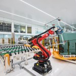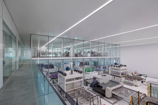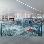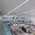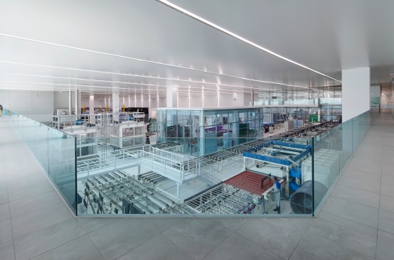 The production offices hovers over the production line having a clear view of most of the areas; attached to this structure a glass floor bridge cantilevers from the corner as a lookout spot.
