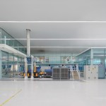 AGP produces glass for car windshield, cleanness is crucial. The white epoxy floor and black out tensile textile for walls and ceiling reinforce this idea for the engineers and operators. The lighting and ventilations are joined together in one slot on the ceiling to minimize the visual noise. The production line is a dry non chemical process and have to be held in a hermetic area, this allowed the use of materials that traditionally wouldn’t be used in such an industrial space. The south façade have a double insulated U glass channels to bring light but protect from the heat of the summer sun exposure. The rest of the façade is cladded in silver aluminium panels, the base of the volume is painted dark gray and takes advantage of the sloped sidewalk to emphasize the main entry without a bigger gesture.