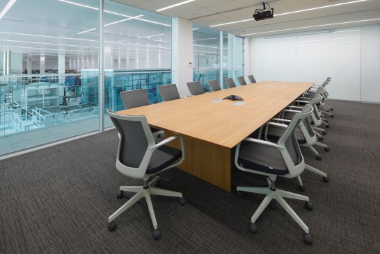 On the first floor from the lobby a white lit corridor with epoxy white floor frames the entrance to meeting rooms, labs, testing rooms and R&D spaces. The dining area acts as a hub for the offices, labs and operators/engineers changing rooms, connecting the back entrance of the facilities.