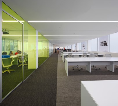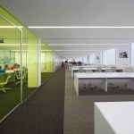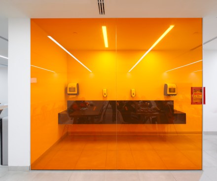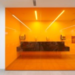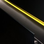 The office area works as a big open space with open meeting rooms. The manager’s offices, kitchenettes, meeting rooms witch are coded with lemon colored glass and services cladded in oak wood are located between the open office and the industrial area. The offices and meeting rooms are all enclosed with glass, acoustic ceilings and carpets were used to optimize the acoustics in these spaces. An inner glass façade reinforces the visual connection between offices and industry line. All the first floor have a light blue tinted glass and all the glass above is white and ultra-clear glass. The stairs act like a palate cleanser being low lit and black painted spaces, the yellow handrail hints a highway line; the lighting is located underneath.