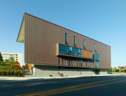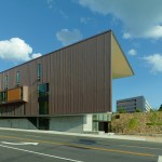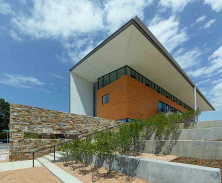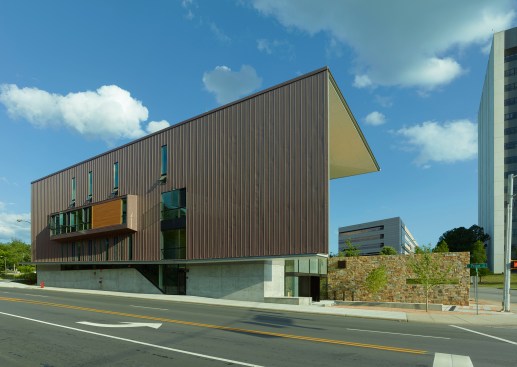A modern shell with a green heart, the building is oriented on the southern edge of the site to leave the majority of the property as an urban park and to make the most of natural lighting and ventilation. The scale of the building focuses on the street context. The north wall greets the Peace Street neighborhood at its natural grade and establishes an urban edge along this rapidly developing transect of the city. Open porches on the south and west elevations welcome the community and underscore a sense of outreach. On the north end of the site, structure and landscape rise, both physically and symbolically, to greet the Government Complex along the higher elevation and forge a strong tie with the government entities there. The stone base of the building and stone walls in the landscape anchor the AIA NC headquarters to its site, establishing a sense of permanence. Juxtaposed with glass and steel, the North Carolina cypress siding gives the project a sense of warmth and familiarity in a building that is clearly of its time.