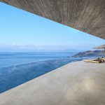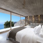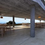The facility is divided into three zones, with the movement in them being done through a corridor defined by the trench of the rocky slope itself. On the lower level is located the accommodation, with a total capacity of 54 people and basic design notion of unobstructed views, proximity to the sea, as well as direct contact with the crops. The guesthouses, which are divided into two, three and four-person rooms, consist of bedrooms with en-suite bathrooms and the necessary functional spaces. On the middle zone is located the open-plan living area with the restaurant and a spacious seating area. The space is expanded with a large sliding opening to the semi-outdoor dining area, under the roof, with the boundaries of close and open space not being clearly defined. In the middle zone, is also located the wellness center with the semi-outdoor and indoor fitness areas, as well as the swimming pool that seems to get “lost” in the blue of the sea. Finally, on the upper level, is located the wine production laboratory with its cellar, the olive oil production laboratory with its traditional millstone, as well as the main auxiliary areas of the facility.