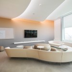 Ceiling panels imitate clouds, and lighting devices located between them at a short distance create a diffused ambient light. This result was achieved due to the specially designed profile capturing the desired angle of the light flux of the strip.