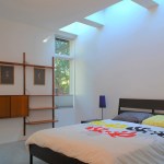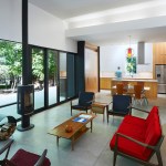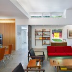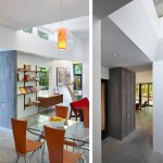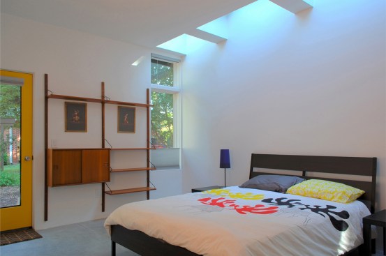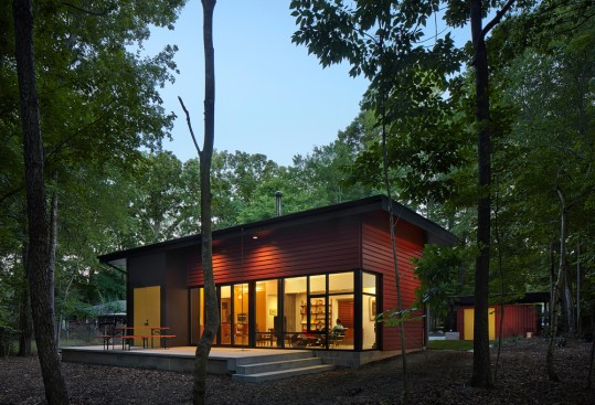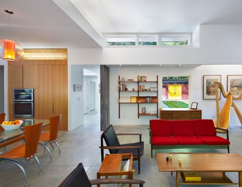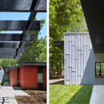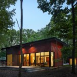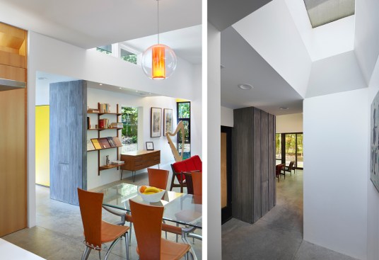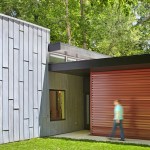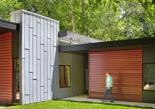 The client asked us to create a home that was modern, green, affordable, and designed for aging. The property is a beautifully wooded half-acre lot in Carrboro. For accessibility, we responded with single-level living that incorporates universal design principles and easily adapted amenities for future aging needs. To control costs, we kept the plan compact and simplified the details. The form of the house shifts to create multiple yards and mediate privacy from neighbors. A vertical zinc wall, inspired by tree bark, visually anchors the house and signifies entry while separating private and public spaces inside. Movement throughout the house (down the hall, through a doorway, or across the room) is always toward a view of the outdoors or natural daylight – creating a connection between inside and outside 24-hours a day.