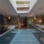 When going up the stairs to the second level you will find the original lighting cube. With the project modifications it was necessary to give the kitchen natural lighting, so this space was used with a new value creating a sculpture of wire woven as fish made by artist Girasol Botello. On the third level, going out the lift, there is a glass bridge connecting the private rooms.