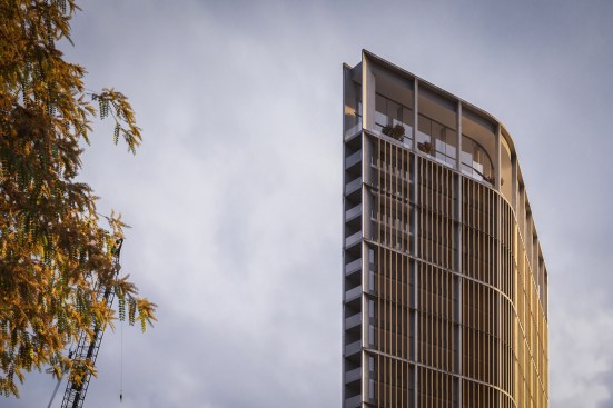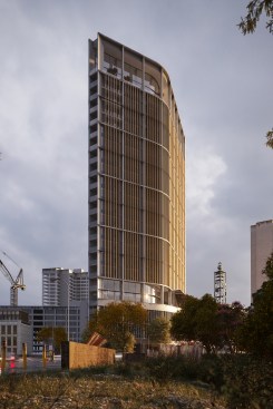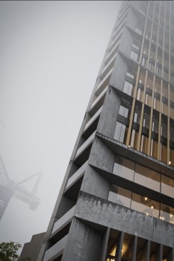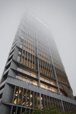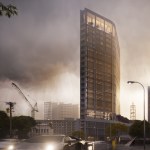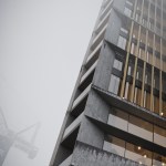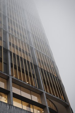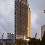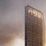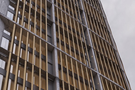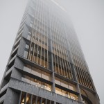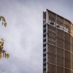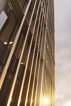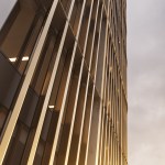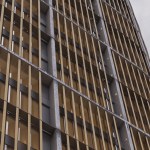 This simple plan form is expressed in an elegant concrete clad framework with terracotta louvers giving a monolithic form. A glass curtain walling system is set back behind louvers within each 4 story bay, with angled solar panels built in to the exposed areas of facade. The layered facade varies behind the louvers depending on the use: Residential floors have terraces setback, whereas the office levels have a maximized floor area. The stair cores and balconies are located at either end of the building and become the continuous features which pin (or spear) the tower back to the ground level. The solidity is further broken down as the plan form gets narrower at the extremes, so the building becomes more transparent.